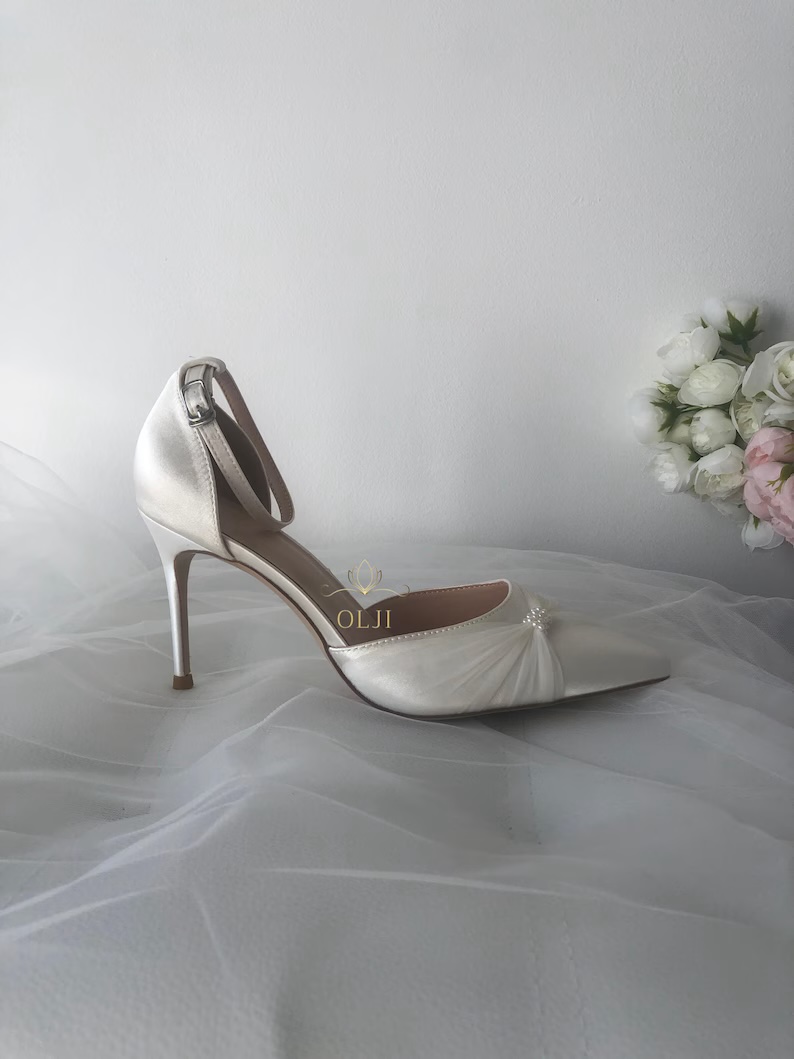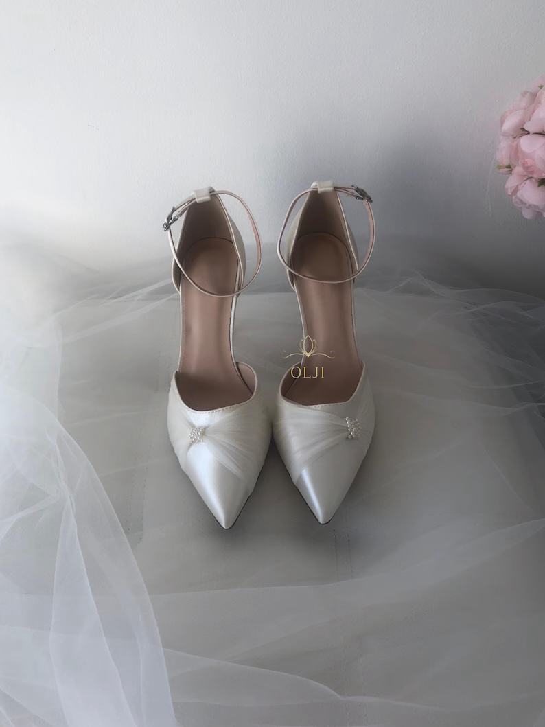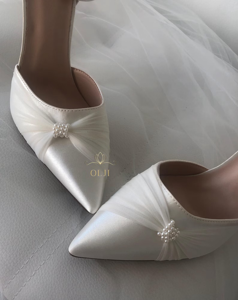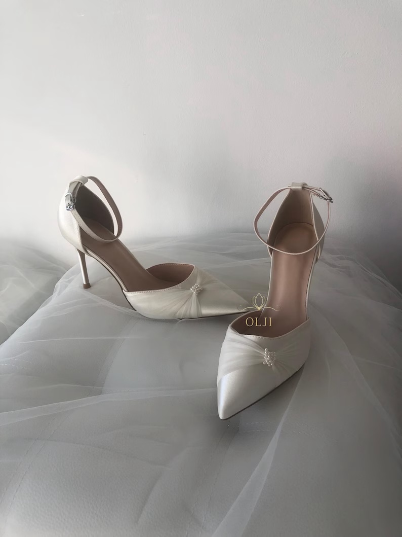Атласні туфлі, оздоблені перлами роблять образ нареченої особливо ефектним і святковим. Мінімалістично викладені перли ніжно переливаються на світлі, створюючи витончений і розкішний вигляд.
